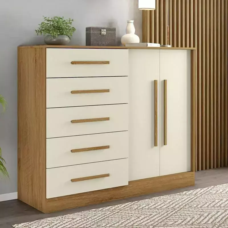Com a cômoda Houston seu quarto estará completo e seus pertences bem organizados. Fabricado em MDP possui cinco gavetas com corrediças telescópicas. Possui duas portas com espaço para os calçados.
