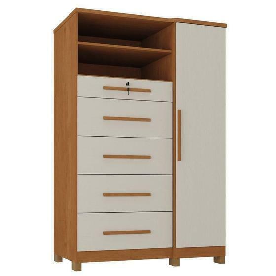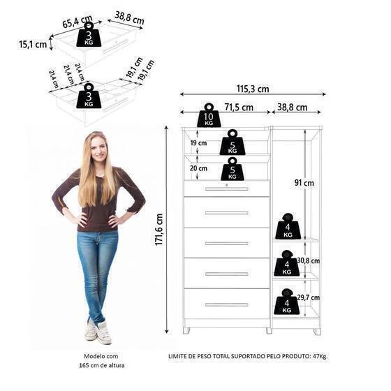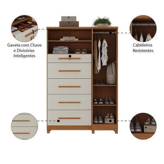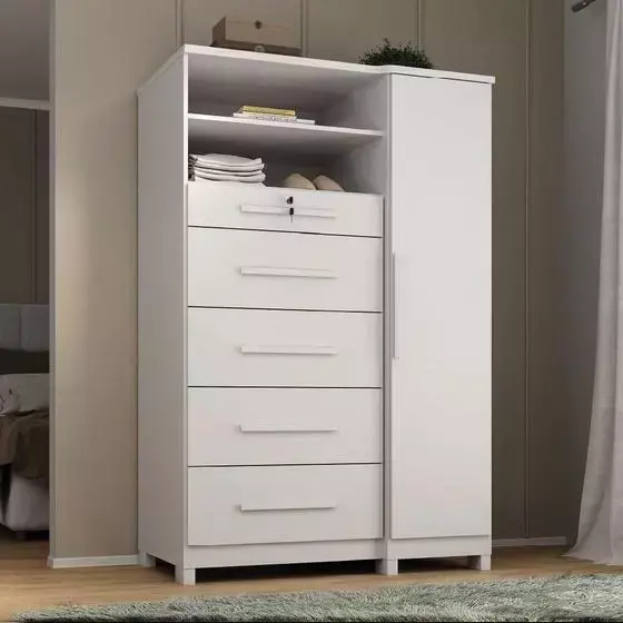 A Cômoda Ísis é um móvel completo para organização e praticidade no dia a dia. Seu design moderno combina gavetas espaçosas, cabideiro metálico e prateleiras bem distribuídas. Conta ainda com uma gaveta com chave e divisórias internas no estilo penteadeira, ideal para guardar acessórios, chaves, cosméticos ou maquiagem com segurança e organização.
