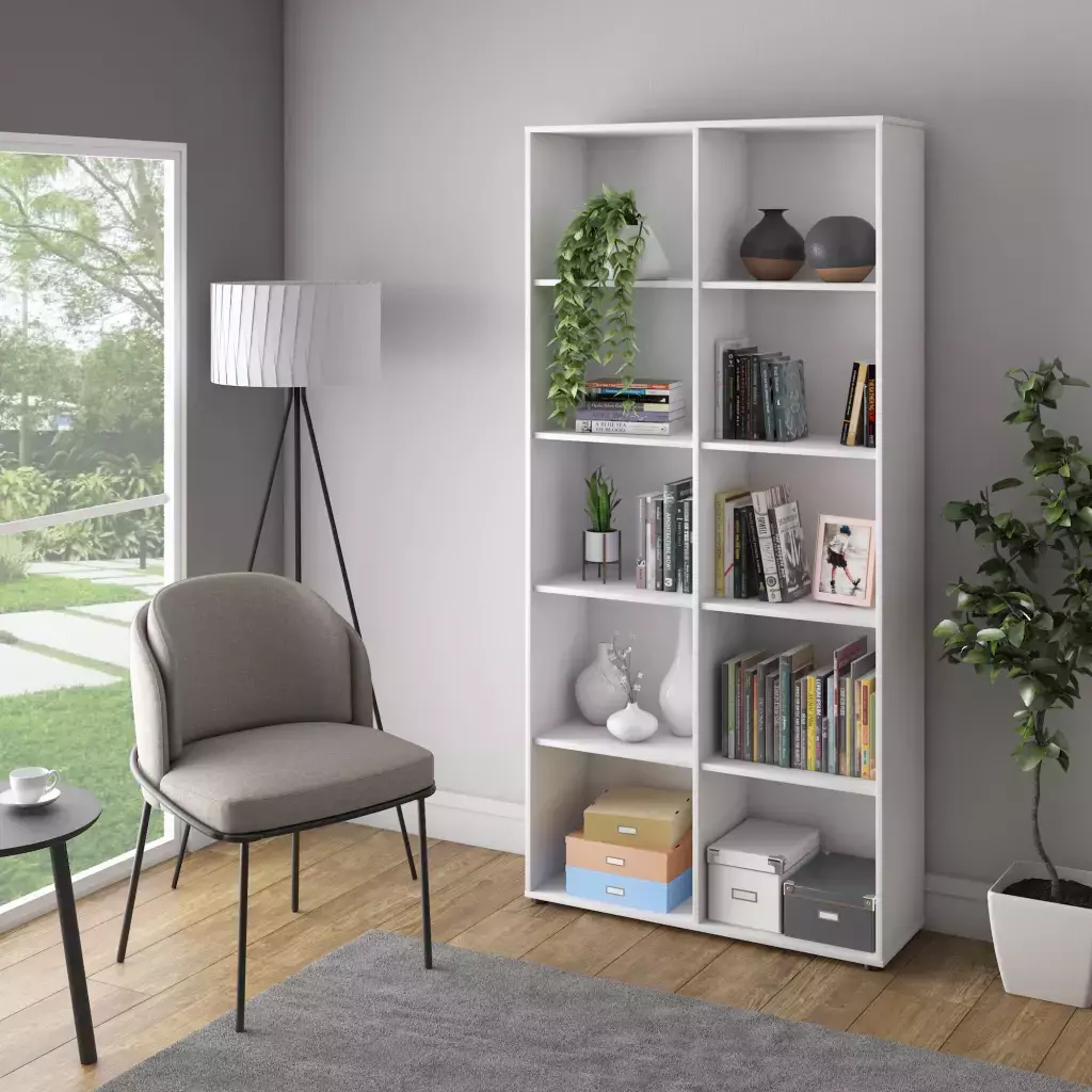 Prateleiras: Composta por 10 nichos organizados em 8 prateleiras fixas, proporcionando amplo espaço para armazenamento de livros, objetos decorativos e itens diversos.