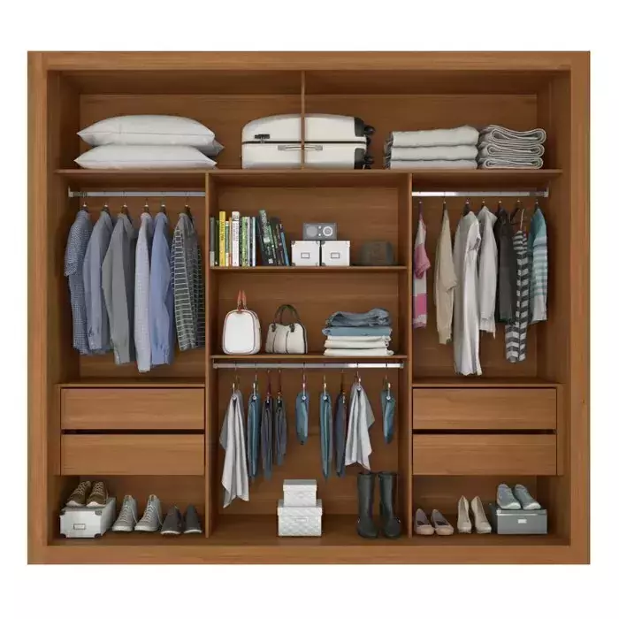 O Guarda Roupa Recife é composto por duas portas de correr elaboradas com batentes em MDP 25mm e ripados compostos por MDF 20mm e 9mm. Dividido com múltiplas repartições para acomodar roupas, objetos e sapatos, 4 gavetas internas com corrediças telescópicas que proporcionam maior amplitude de abertura, calceiro e cabideiros metálicos com suportes em alumínio, maleiro espaçoso e acabamento com revestimento interno e externo. Design moderno e funcional proporcionam organização, charme e beleza na decoração de seu quarto! Além de tudo isso, também possui um par de espelhos na porta.