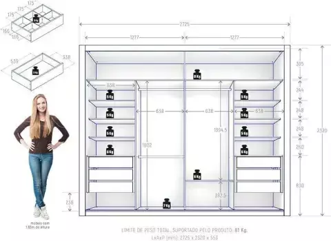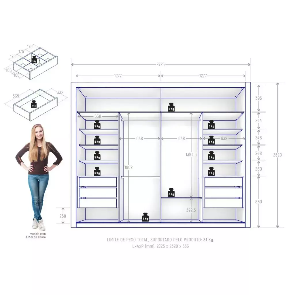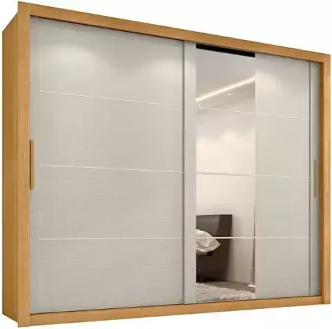O Guarda Roupa Grécia Plus tem excelentes repartições e amplo espaço para você organizar roupas, edredons, travesseiros, calçados e objetos pessoais. Moderno e elegante, tem duas portas de correr e seis gavetas, sendo a primeira gaveta de cada lado com colmeia para organizar peças e objetos pessoais, todas com corrediças telescópicas que possibilitam maior amplitude de abertura. Conta também com sete prateleiras mais o maleiro. O Guarda Roupa Grécia Plus reúne harmoniosamente beleza, qualidade e durabilidade! Além disso, esse roupeiro acompanha espelhos na porta.