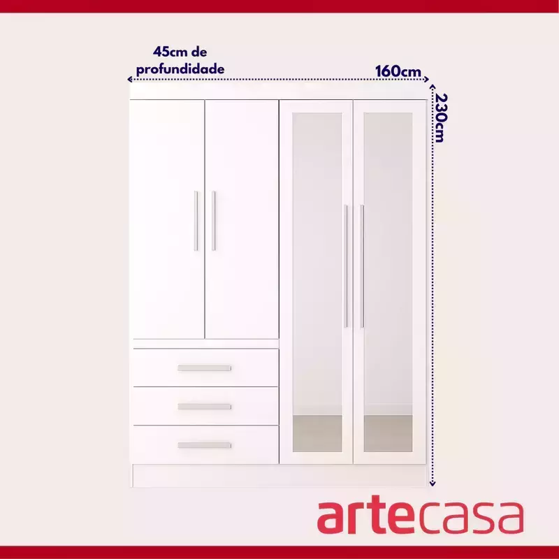 O Guarda-Roupa Casal Tancredo é uma opção espaçosa e funcional para organização do quarto. Conta com quatro portas e três gavetas com corrediças telescópicas, garantindo deslizamento suave e durabilidade. Possui maleiro interno para melhor aproveitamento do espaço e cabideiro em alumínio para acomodar roupas com praticidade. Os puxadores em MDF combinam com o design moderno do móvel. Sua estrutura, incluindo portas, gavetas e divisórias, é fabricada em MDF de 15 mm com acabamento em pintura U.V., proporcionando resistência e proteção.
