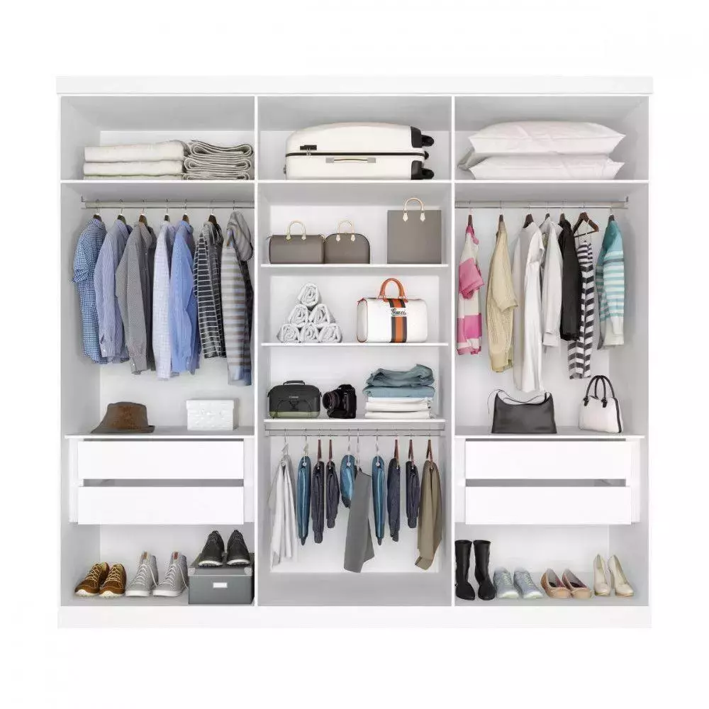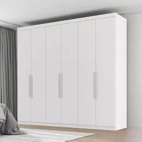 O Roupeiro Evelize combina amplo espaço interno com design funcional e elegante. Possui quatro gavetas internas com corrediças telescópicas, cabideiros metálicos para melhor organização das roupas e maleiro para itens maiores ou menos utilizados. Seu acabamento sofisticado é complementado por puxadores em MDF, garantindo praticidade e durabilidade.