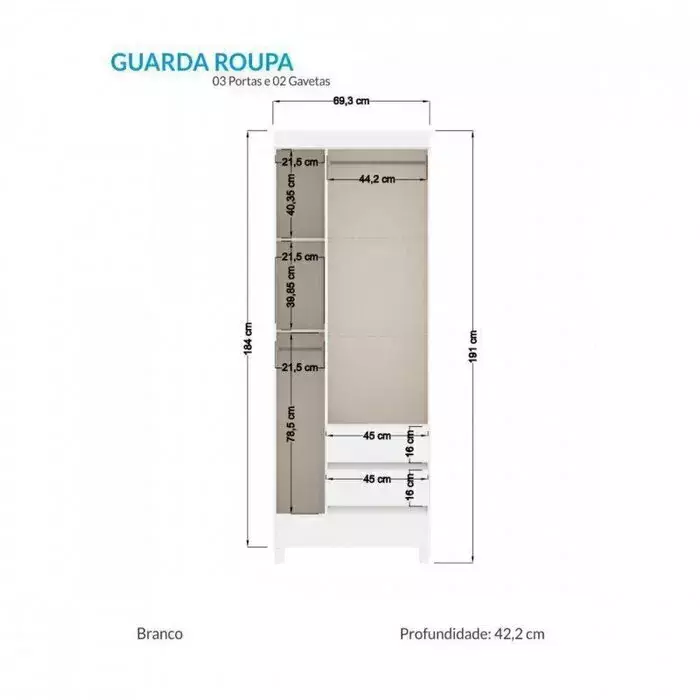 Um bom quarto pede um bom guarda-roupa, não é? E, além de ser muito útil para manter as suas roupas organizadas, é importante também que ele dê um toque especial no ambiente. Este modelo oferece diversos benefícios para isso, não perca tempo! 02 amplas gavetas que deslizam sobre corrediças metálicas com suavidade, garantindo qualidade ao móvel. Puxadores em ABS, deixando o roupeiro com um design muito mais moderno. Amplas prateleiras, com muito mais espaço para guardar todas as roupas dobradas, caixas, sapatos, decoração, etc. O acabamento é em verniz brilhante, tudo feito dentro dos padrões de preservação do meio ambiente, com sustentabilidade. Possui pés em PVC, permitindo que o guarda-roupa fique elevado do chão, facilitando a limpeza embaixo dele.