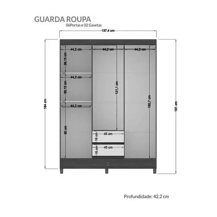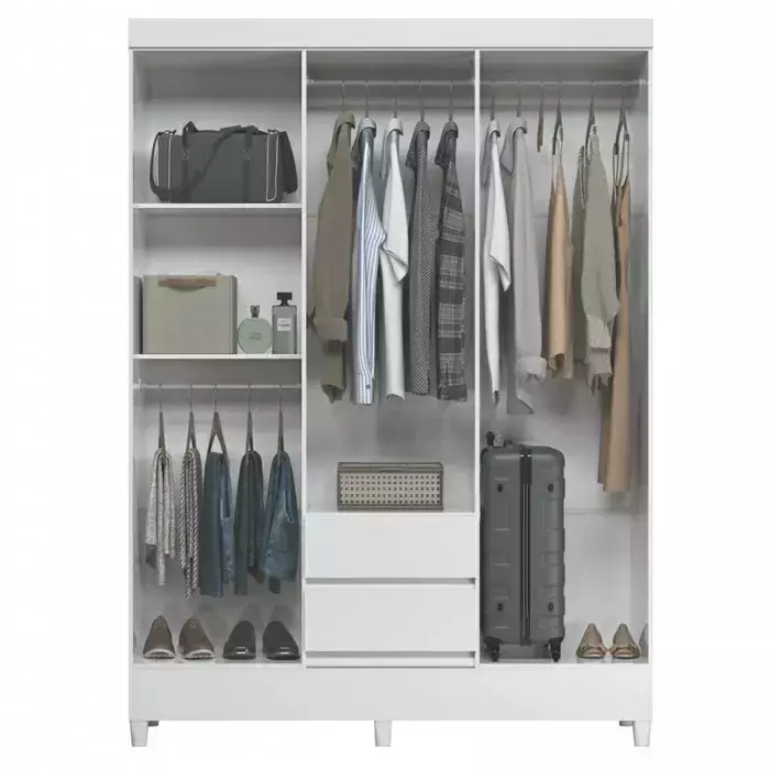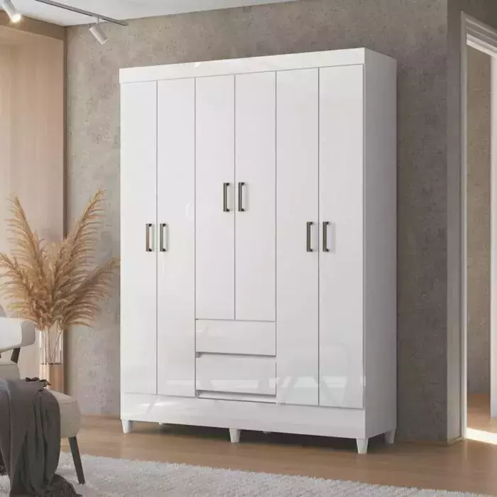 Um guarda-roupa muito bonito e funcional com 02 amplas gavetas que deslizam sobre corrediças metálicas fazendo com que o deslizar seja bem suave. Suas amplas prateleiras internas permitem acomodar as roupas dobradas com muita organização, além de caixas, sapatos, decoração, etc. E seus 02 Cabideiros/Calceiros em alumínio, permitem pendurar as roupas de forma organizada e com muita qualidade. Seus puxadores em ABS proporcionam um design lindo e moderno. Possui todas as funcionalidades necessárias para guardar as roupas e objetos. O acabamento é em verniz brilhante, tudo feito dentro dos padrões de preservação do meio ambiente, com sustentabilidade. Possui pés em PVC, permitindo que o guarda-roupa fique elevado do chão, facilitando a limpeza embaixo dele.
