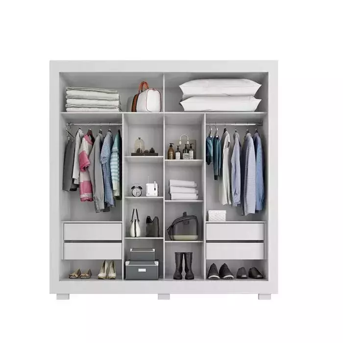 O Guarda Roupa Platinum é um produto com design moderno e funcional, perfeito para quem busca organizar e otimizar o espaço. Contém duas portas de correr, com excelentes repartições, seis prateleiras, maleiro, além de quatro gavetas com corrediças telescópicas que possibilitam maior amplitude de abertura. Puxadores em MDF, cabideiro metálico e seis pés, ideal para facilitar a limpeza embaixo do guarda roupa! O guarda roupa também conta com espelho!