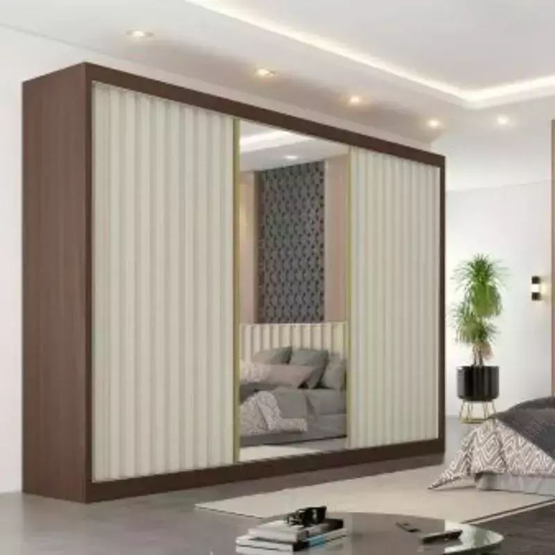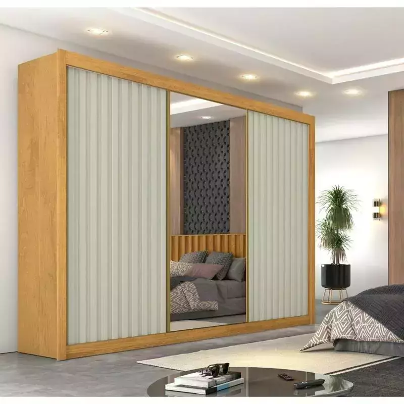 O Guarda Roupa Casal Ripado com Espelho 3 Portas de Correr 100% MDF Barcelona, feito inteiramente de MDF, possui três portas de correr uma espelhada e duas com detalhes ripados em MDF. Ele oferece uma divisão para ele e ela, além de um amplo espaço interno com diversas prateleiras e seis gavetas internas equipadas com corrediças telescópicas.
