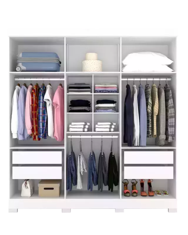 Nada melhor que ter seu ambiente de descanso organizado e em grande estilo. O Guarda Roupa Santana foi desenvolvido para garantir que suas roupas e acessórios estejam bem cuidados. Fabricado 100% em MDF com seis portas e quatro gavetas.