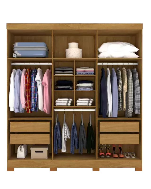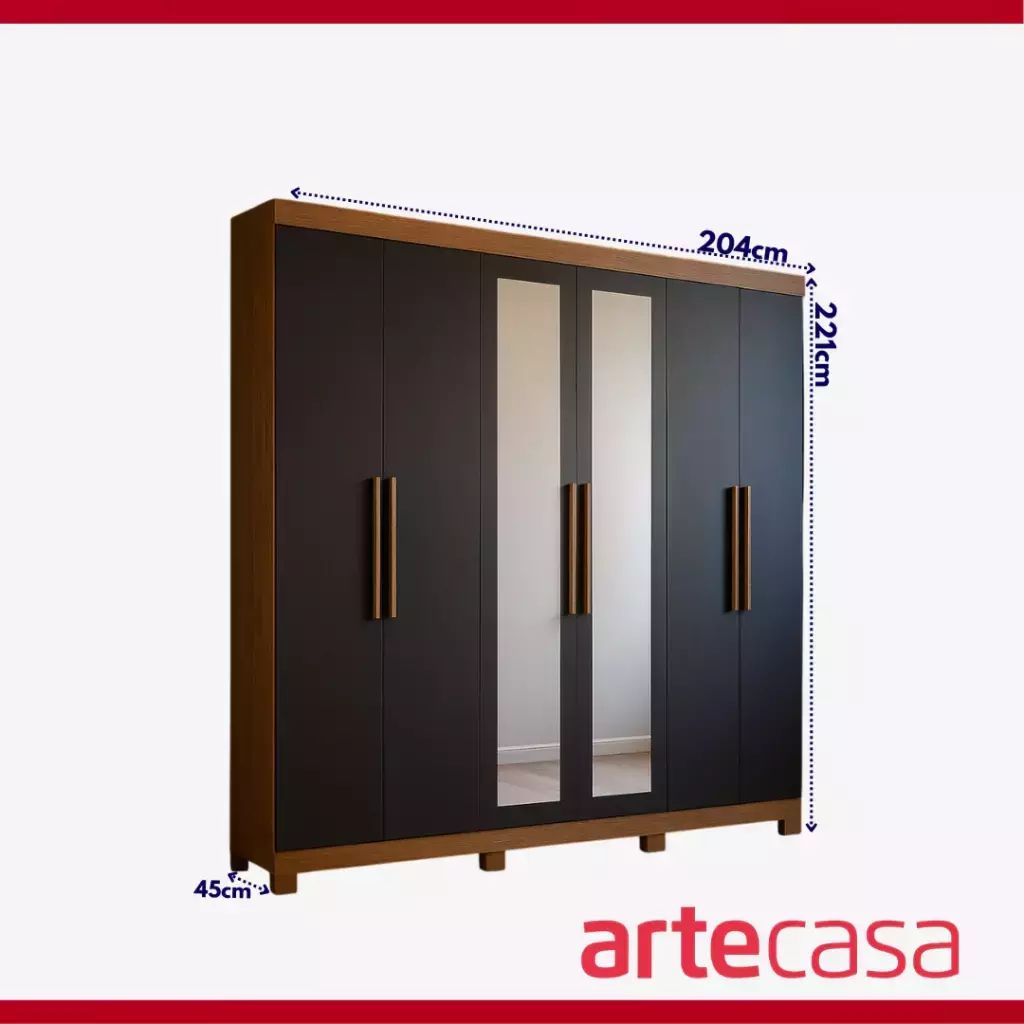 Nada melhor que ter seu ambiente de descanso organizado e em grande estilo. O Guarda Roupa Santana foi desenvolvido para garantir que suas roupas e acessórios estejam bem cuidados. Fabricado 100% em MDF com seis portas e quatro gavetas.