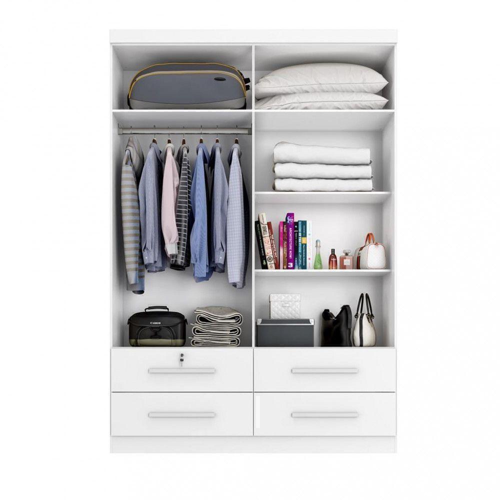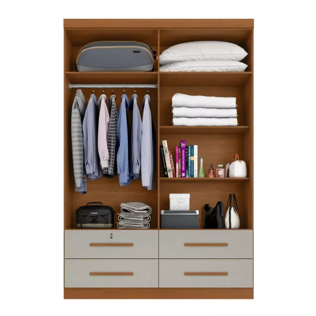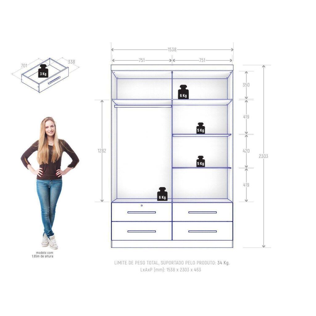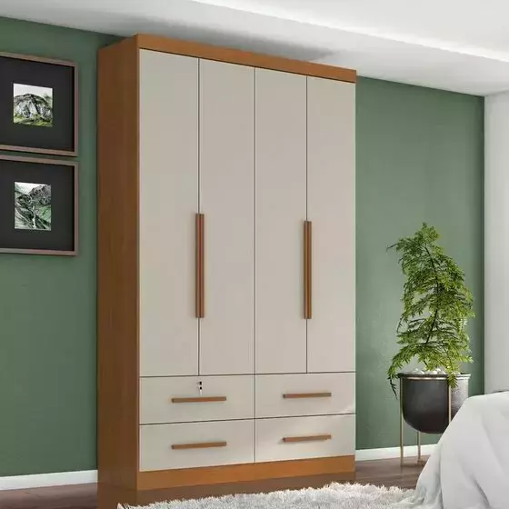 Diferenciais: 4 portas de abrir, gavetas com corrediças telescópicas, 1 gaveta com chave, puxadores em MDF e cabideiros metálicos resistentes